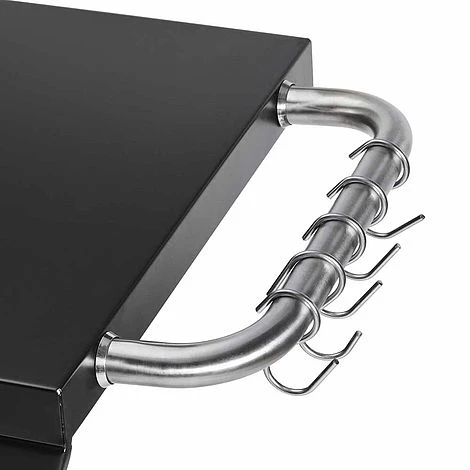 There is an integrated thermometer so, you can see the temperature inside, without opening the lid and losing all the heat. It has an enamel-coated 60-centimetre grill surface, with an integrated warming shelf for keeping food warm or for resting meat. It also has two side tables (one that also doubles up as an additional burner) and five accessory hooks to hang all your barbecue tools from.