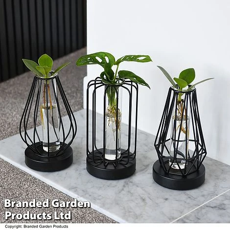 Hydroponic Collection in Turin Glass features three foliage houseplants: Syngoniun, Monstera and Ctenanthe.