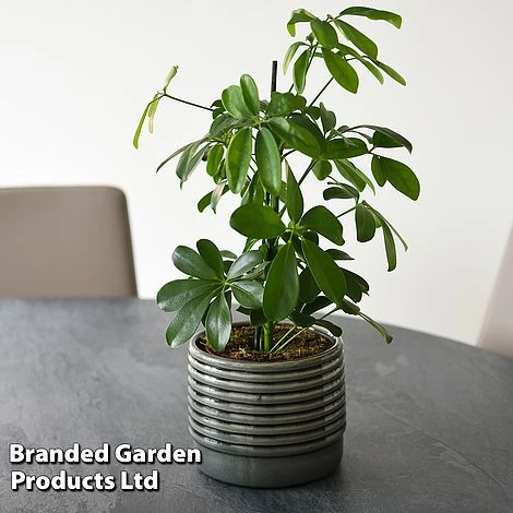 Schefflera ‘Nora’ is a great starter houseplant for novice growers. It’s fast growing, undemanding and will cope with some neglect. The glossy, palmate foliage radiates from a central point, creating an elegant, umbrella shape. Plants are well-branching, growing into erect, bushy shrubs. Maximum height: 1.5m (60in). Maximum spread: 1m (40in).