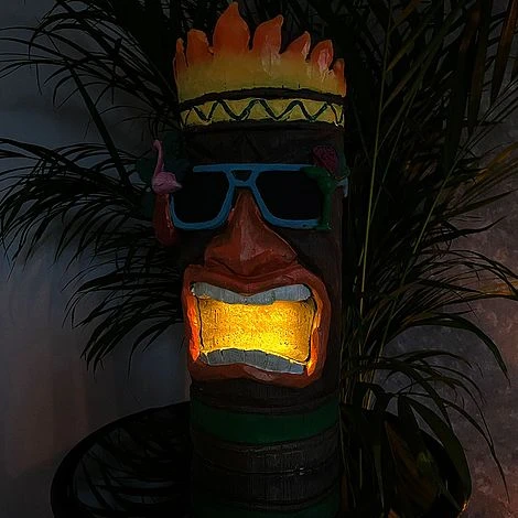 A striking garden solar ornament with vivid colours and an attention grabbing Tiki design, which is made to look as if it is ‘carved in wood’. This Tiki ornament even sports sunglasses with watermelon and a flamingo on! This Tiki ornament is an excellent way of adding colour and a lively atmosphere to any outdoor space. Perfect for lighting up darker corners of the garden or pathways.